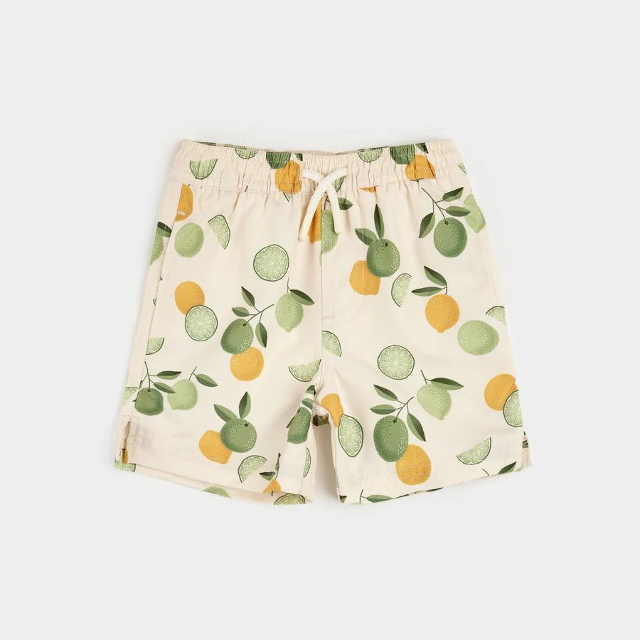 These lemon & lime swim trunks are a vacation and summer staple! The fresh and fruity shorts coordinate with the green long-sleeved rash guard from the same range or can be worn on their own when heading to the pool. The elasticated waistband makes dressing and drying fuss-free while the drawstring tie ensures the trunks stay in place while they practise their turns, flips and underwater handstands.