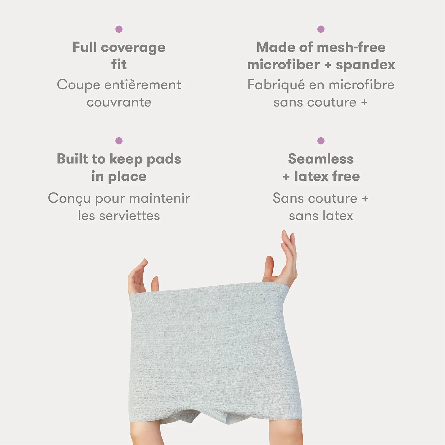 Mesh-free, mess-free recovery wear that stretches even more than you have. Soft, seamless and breathable to keep pads (and everything else) in place, without squeezing or pulling. Pack in the hospital bag for use after the first postpartum trips at the hospital and back at home. Made from super soft, breathable, mesh-free, and latex-free microfiber and spandex.