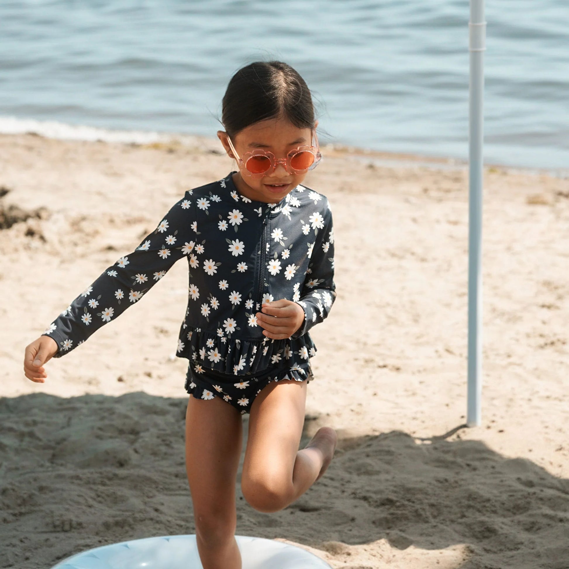Bringing a classic summery style to a pool or beach near you, this Daisies print rash guard set is perfect for splashing in the pool or building sandcastles at the beach. The 2-piece set includes a long-sleeved rash guard and high waisted pants, both helping to keep her delicate skin covered in the sun. Made with quick-drying weft knitted fabric, the set is comfortable wet or dry and is designed with UPF50+ sun protection. The cheerful set is stretchy, practical and fun, giving her the confidence to play freely on sunny days.