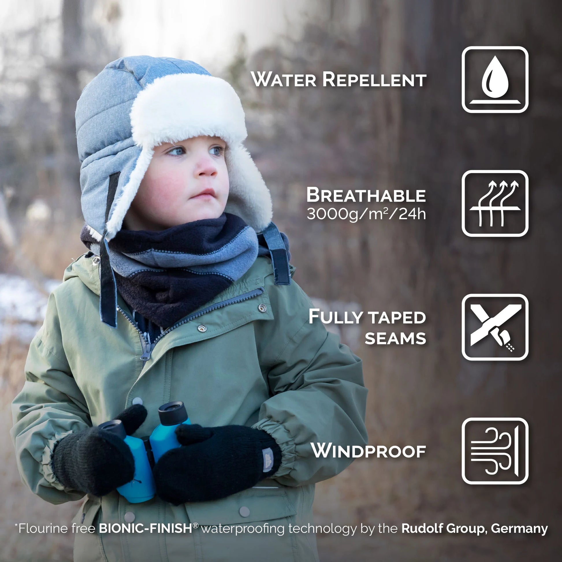 Carefully constructed for the best heat retention possible while ensuring the perfect fit for growing heads! The water-repellent and windproof shell protects from windchill, while the interior is insulated and includes faux fur on the earflaps. The hook-and-loop closure ensures the hat stays secure on windy days or when a baby pulls. Wear it three different ways, on countless adventures!