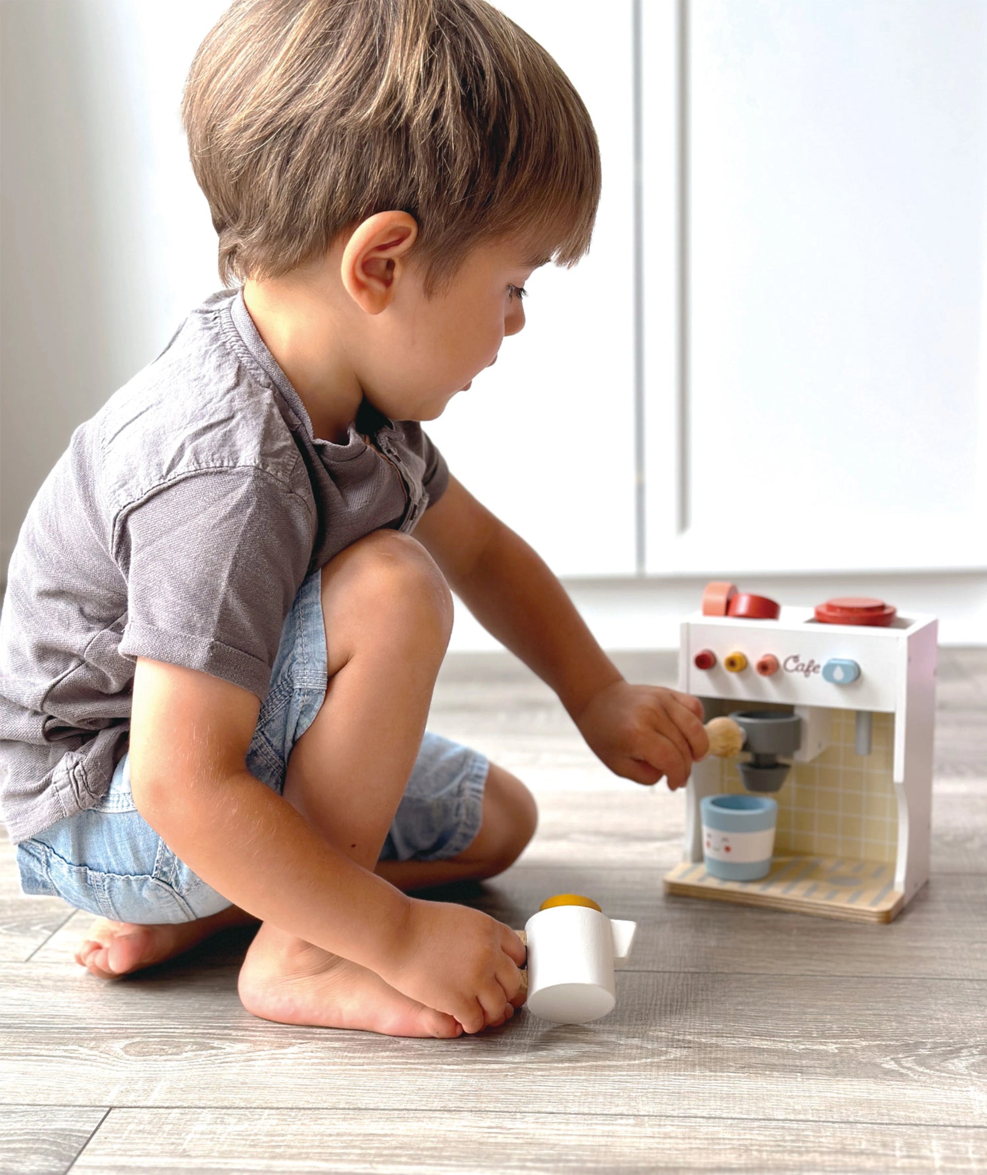 This set includes a wooden coffee maker unit with 4 squishy buttons, a coffee pod holder, 3 coffee pods, a wooden takeaway cup with removable lid, and a pretend milk jug.