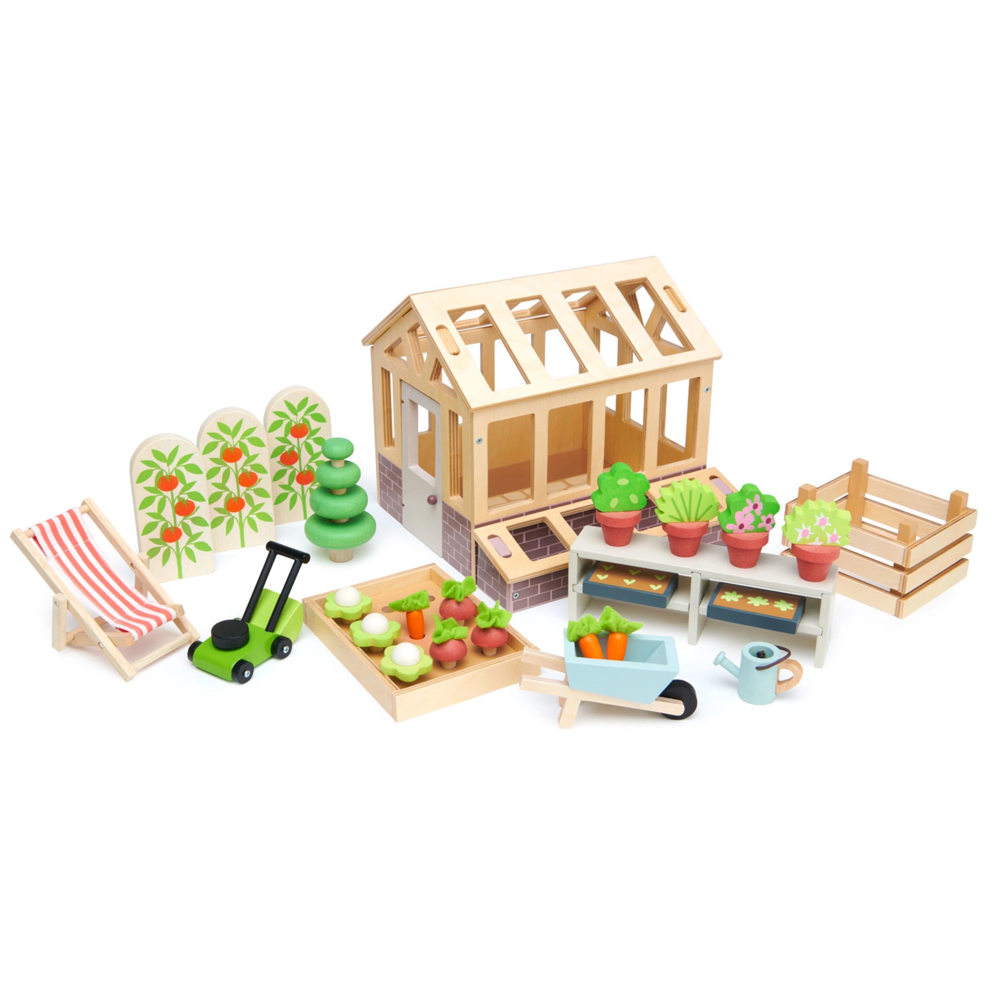 For children who love nature and playing in the garden, this set is ideal for encouraging green fingers. A traditional plywood greenhouse with base has an opening door, and 2 removable roof panels. It can be filled with 2 seed trays, a planting bench, 4 pot plants, and 3 tomato shrubs. We have included a cold frame for nurturing seeds, a raised bed with 9 vegetables, a compost bin, a lawnmower, a watering can, a topiary tree, a wheelbarrow, and last but not least, a deck chair for your dolls to enjoy the fruits of their labour.
