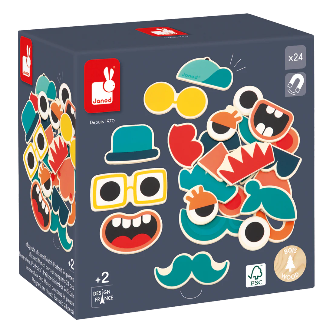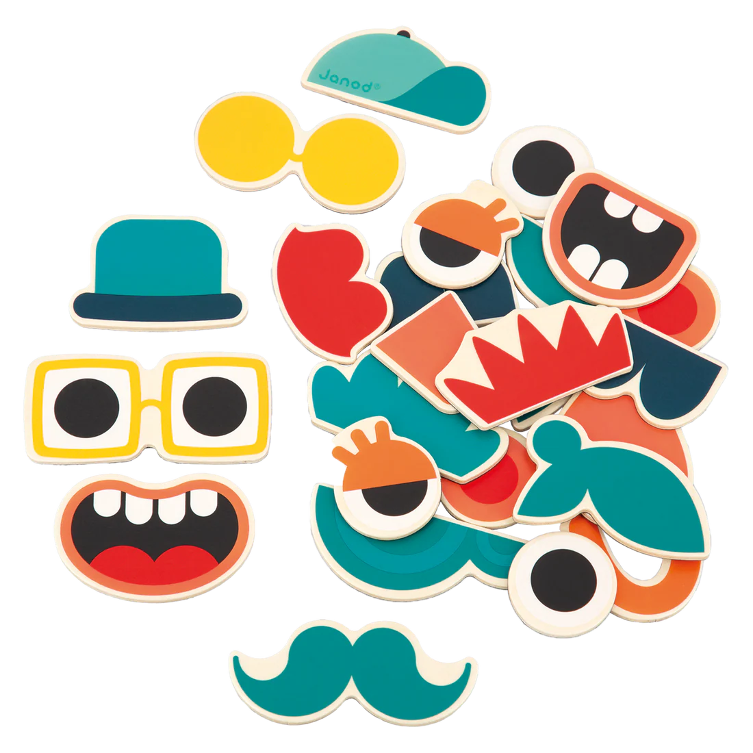Cap, mustache and glasses? What will be the funniest combination? Create the funniest character by mixing eyes, noses, mouths, glasses... This kit is made up of 24 wooden magnets that can be placed on magnetic boards, or any other magnetic surface. Your child will be able to develop their imagination and dexterity while having fun. FSC™ wooden magnetic toy. For children from 2 years old.