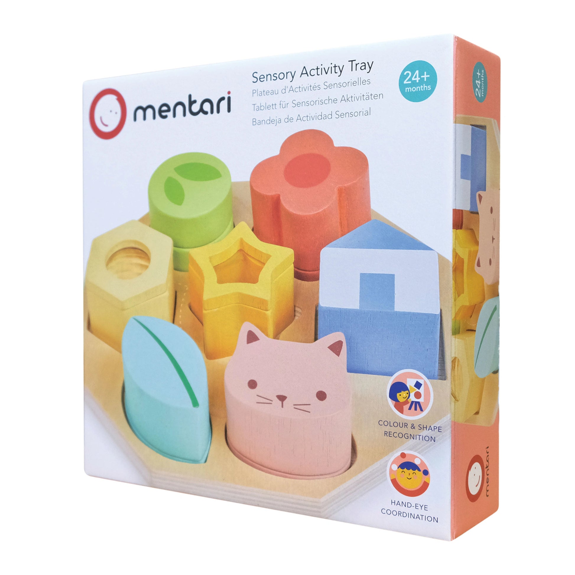 A wooden sensory board featuring 7 removable chunky shapes, each providing a different sound or texture. Look through the honeycomb shape, make a clacking sound with the green cylinder, shake the leaf to hear the little beads inside, stroke the fur fabric on the back of the cat, press the flower for sensory joy, shake the bell inside the house, and look through the coloured lens in the star. Helps improve colour and shape recognition as well as hand-eye coordination.